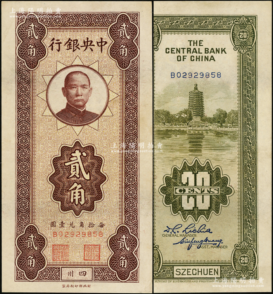 中央银行竖式贰角,四川地名,资深藏家出品,上佳品相,九成新