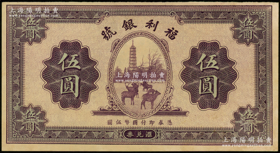 民国廿二年(1933年)福利银号汇兑券伍圆,上印塔下鹿群图;源于前辈名家之遗藏,未折九五成新