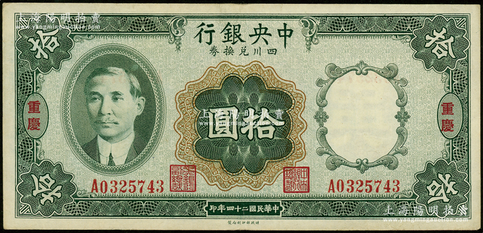 民国二十四年(1935年)中央银行四川兑换券拾圆,重庆地名,资深藏家出品,原票八成新