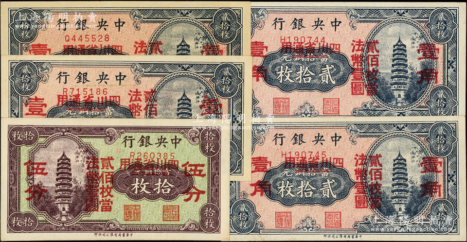 中央银行“四川省通用”辅币券共5枚,详分:拾枚改伍分单字轨1枚,贰拾枚改壹角4枚(其中2枚连号),均属单字轨;资深藏家出品,九五至全新