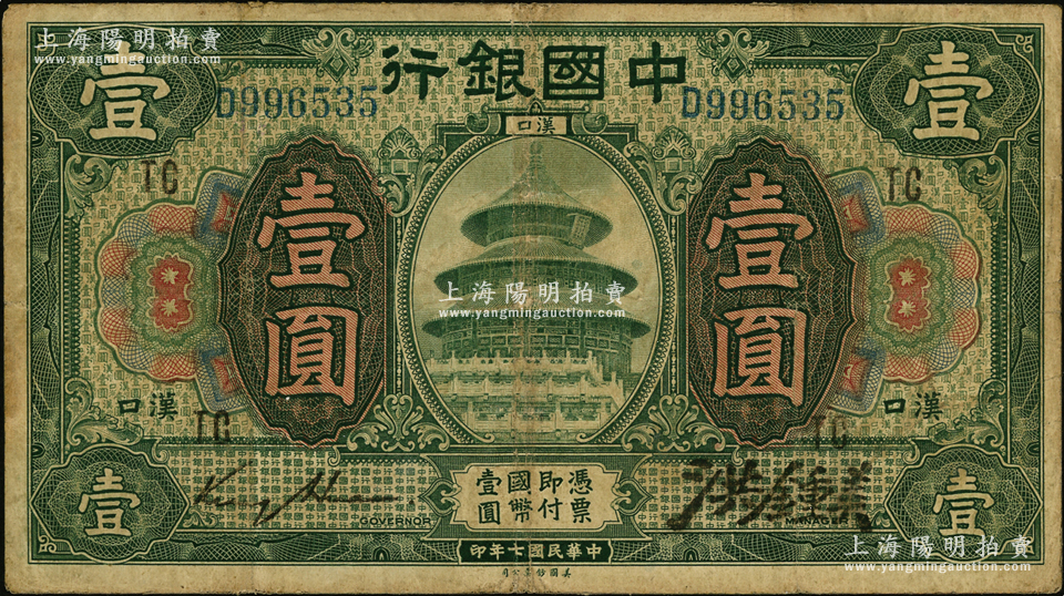 民国七年(1918年)中国银行绿色壹圆,汉口地名,金还·洪锺美签名,加印领券“TC”;源于前辈名家之遗藏,少见,七成新