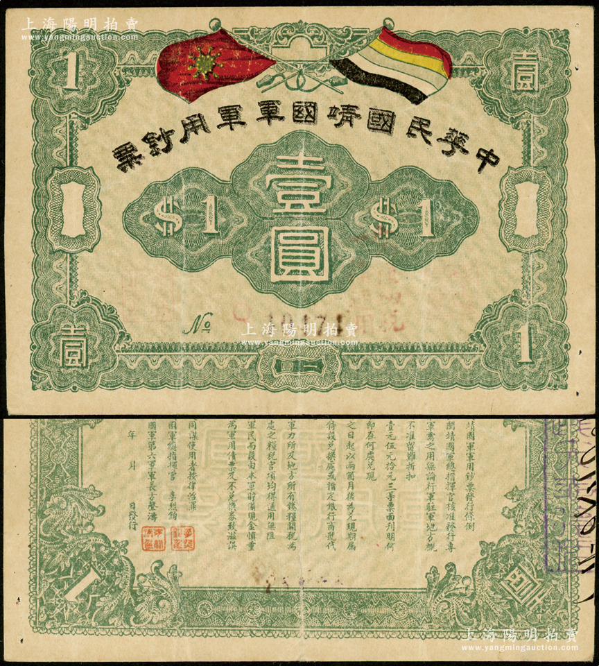 中华民国靖国军军用钞票壹圆,属护法战争时期征闽靖国军方声涛部所发行;资深藏家出品,原票八成新