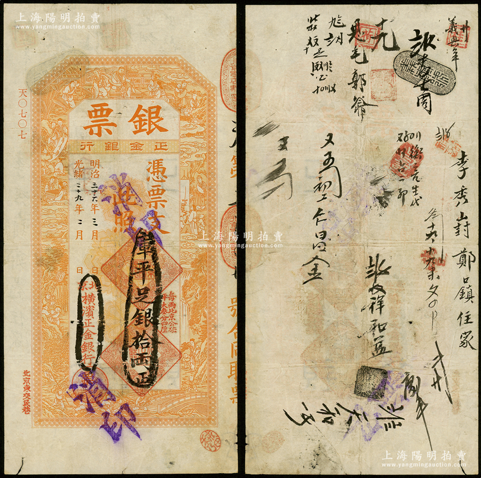 光绪二十九年(1903年)北京横滨正金银行“银票”库平足银拾两,上印百子戏春图,寓意多福多寿、多子多孙,极富传统吉祥韵味,且票内有“正金银行”行名水印;此“库平”版存世稀见,原票八成新,值得预览和重视