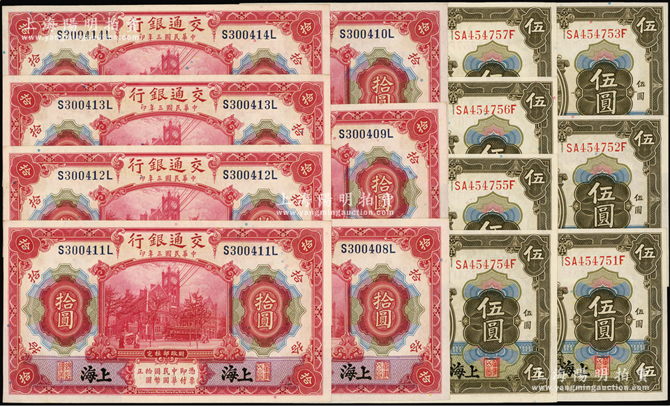 民国三年(1914年)交通银行橄色伍圆、红色拾圆各7枚连号,合计共有14枚,上海地名;源于前辈名家之遗藏,全新