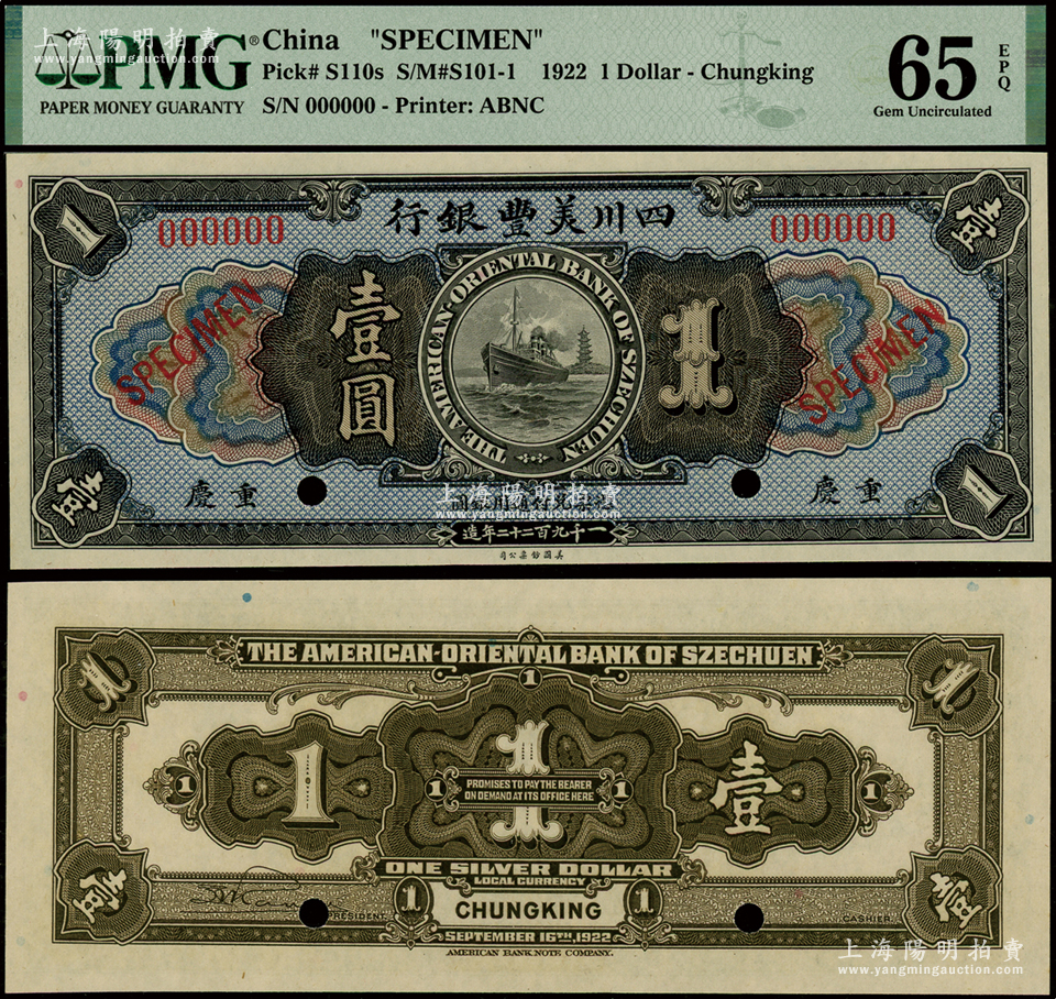 1922年四川美丰银行壹圆样本券,重庆地名,少见,全新