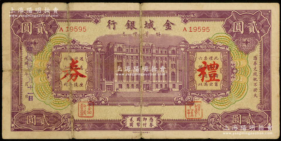 民国廿五年(1936年)金城银行储蓄礼券贰圆,少见,原票七成新