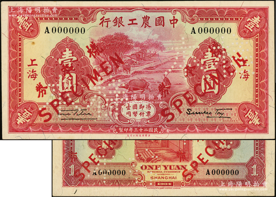 民国二十三年(1934年)中国农工银行壹圆样本券,上海地名,正背共2枚(已粘合),上佳品相,九五成新