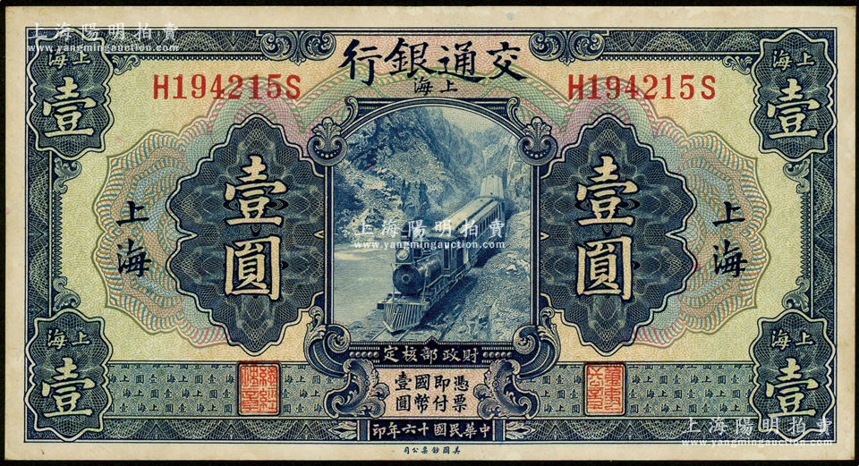 民国十六年(1927年)交通银行蓝色壹圆,上海地名,印章版;源于前辈名家之遗藏,原票九五成新