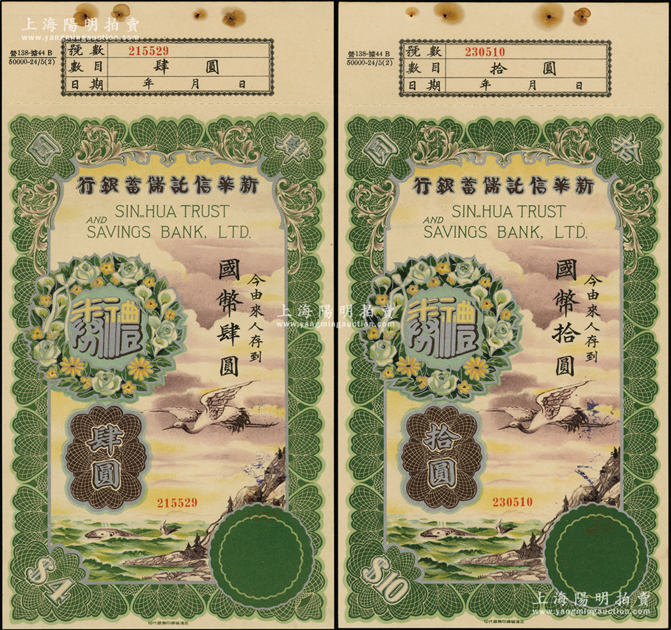 民国年·新华信托储蓄银行礼券国币肆圆、拾圆共2枚不同,上印乘风破浪图,烫银版,图案十分美观,少见,九五成新