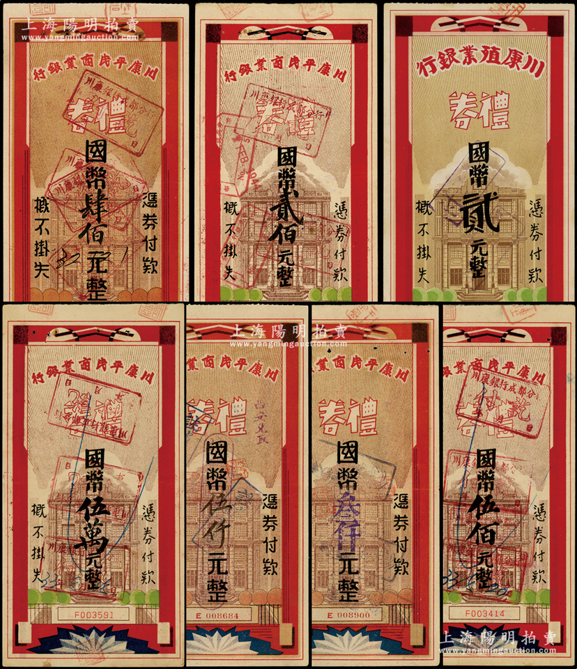 民国礼券共7种,详分:1939年川康殖业银行礼券贰元;1943至1945年川康平民商业银行礼券贰佰元、肆佰元、伍佰元、叁仟元、伍仟元、伍万元;八五至九成新