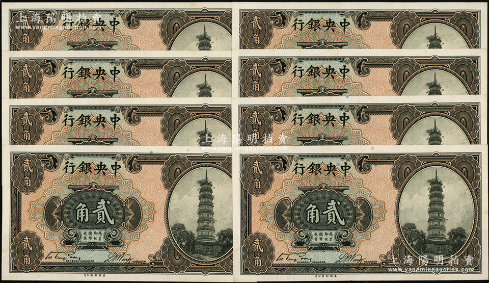 中央银行美钞版花塔图贰角共8枚连号,单字轨,均属第一版宋子文·黄隆生签名;源于前辈名家之遗藏,九八成新