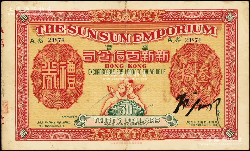 1948年(香港)新新百货公司礼券港币叁拾圆,上印二小天使,背印新新百货和新新酒店大楼,属近代著名之百货公司;海外藏家出品,少见,近八成新