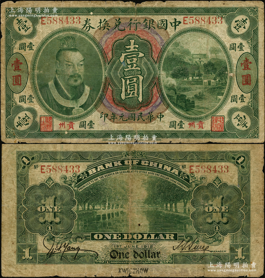 民国元年(1912年)中国银行兑换券黄帝像壹圆,贵州地名,孙多森·杨瑜统签名,少见,原票七成新