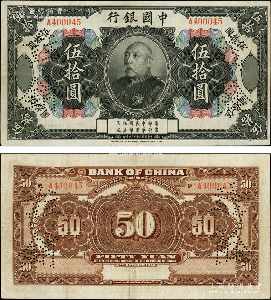民国三年(1914年)中国银行袁世凯像伍拾圆,上有“注销”针孔,中国银行纸币之名誉品;前辈藏家出品,罕见,八五成新