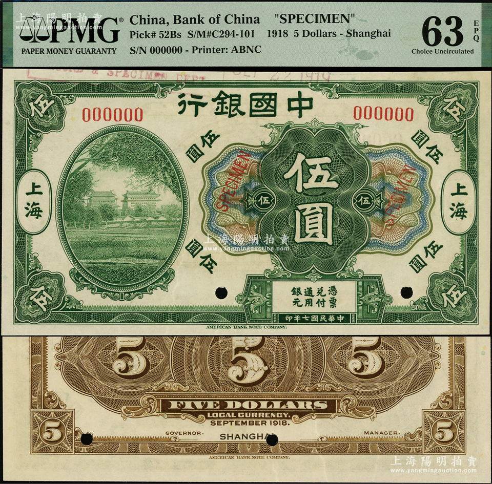 民国七年(1918年)中国银行绿色北京前门图伍圆样本券,上海地名,少见,九八成新