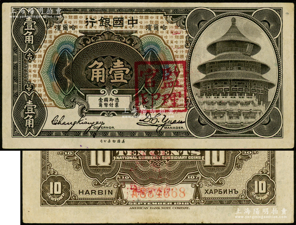 1918年中国银行壹角,哈尔滨地名,张嘉璈·袁大启签名,加盖“监理官印”;海外藏家出品,少见,原票八五成新