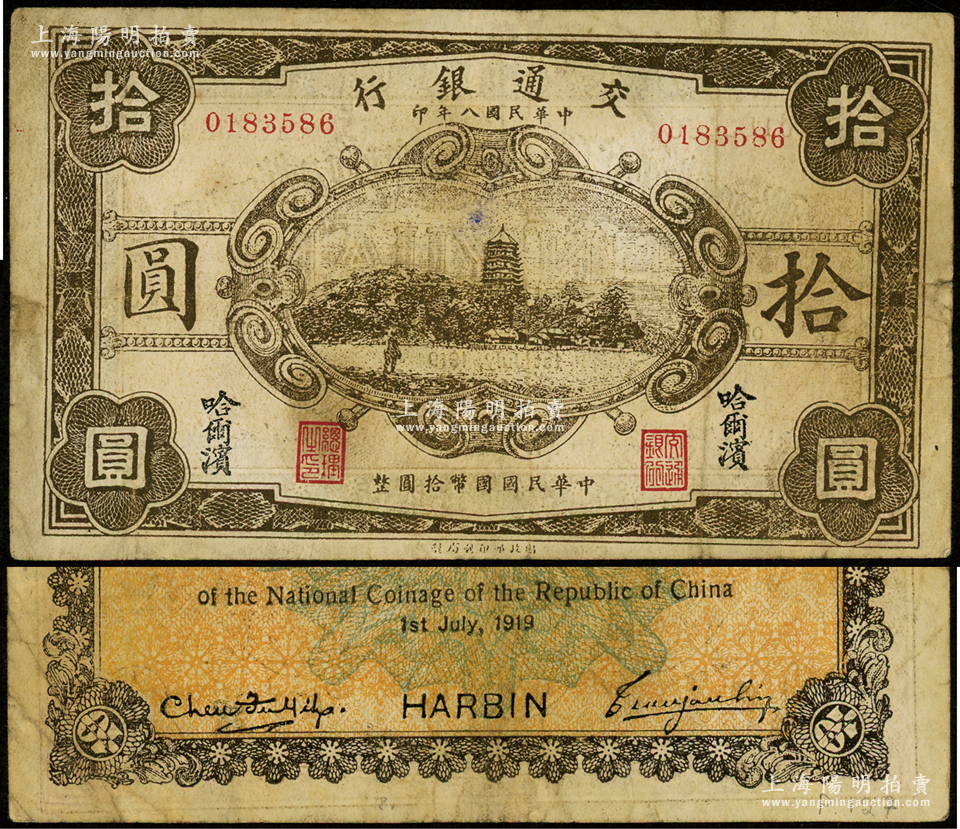 民国八年(1919年)交通银行拾圆,哈尔滨地名,曹汝霖·陈福颐签名,乃属历史同时期之老假票,七五成新