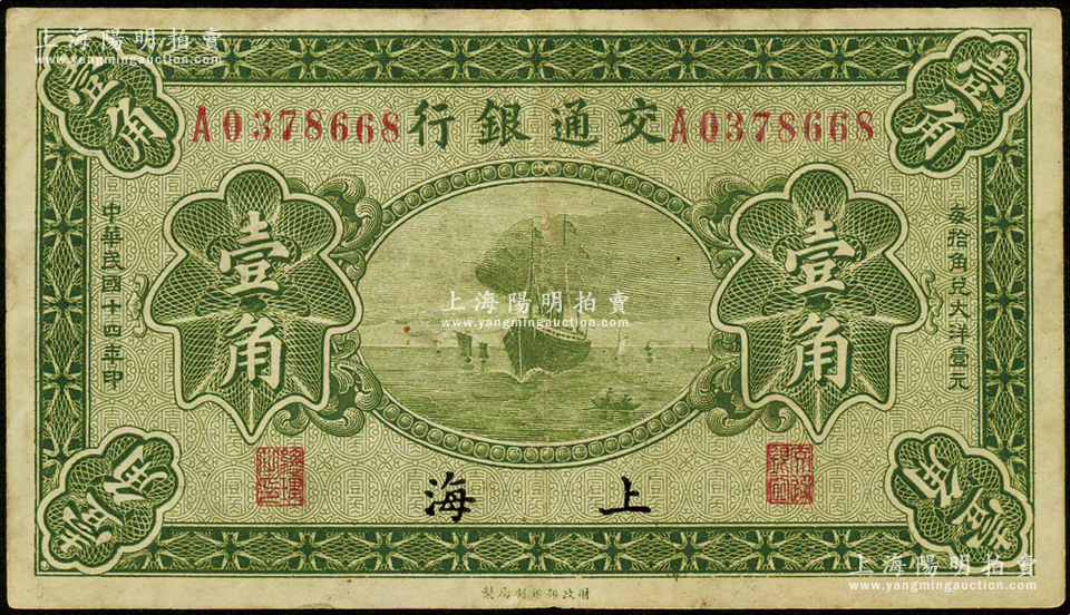 民国十四年(1925年)交通银行壹角,上海地名,背印梁士诒·盛竹书签名;江南藏家出品,原票八成新