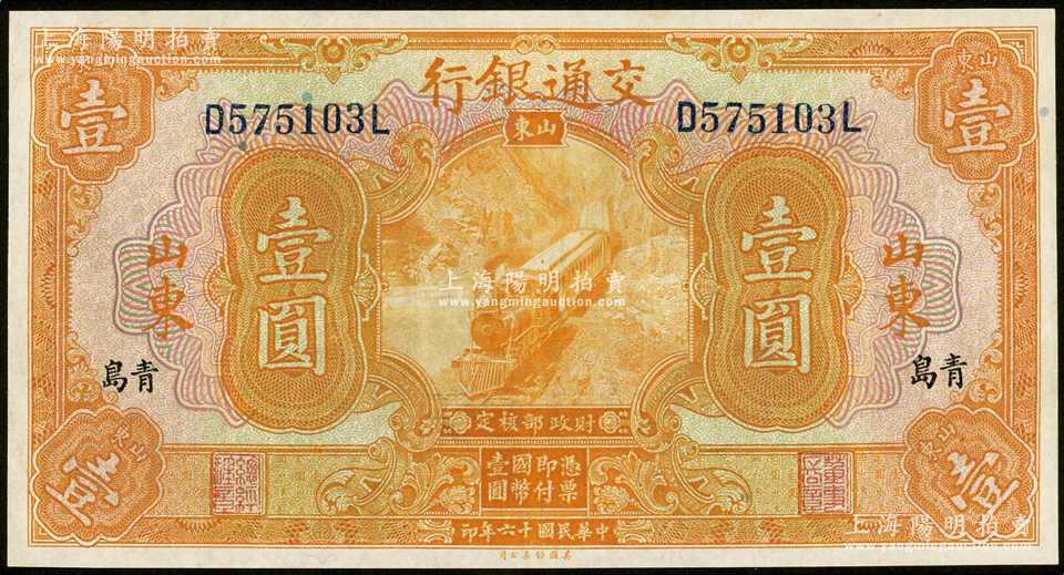 民国十六年(1927年)交通银行桔色壹圆,山东·青岛地名,印章版/背英文签名,九至九五成新