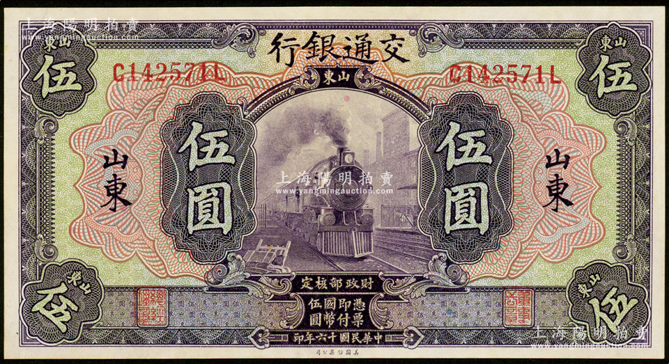 民国十六年(1927年)交通银行紫色伍圆,山东地名,印章版,九八成新