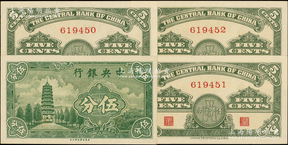 民国二十八年(1939年)中央银行美商永宁版伍分“无字轨”共3枚连号,源于前辈名家之遗藏,少见,全新
