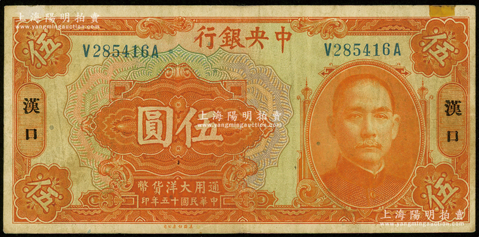 民国十五年(1926年)中央银行大洋伍圆,汉口地名,前后字轨,宋子文·陈行签名;法国藏家出品,八成新