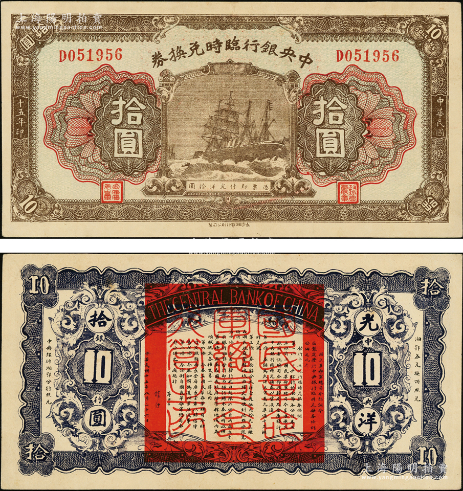 民国十五年(1926年)中央银行临时兑换券拾圆,背印国民革命军总司令部蒋中正之告示,且属难得之上佳品相,九成新
