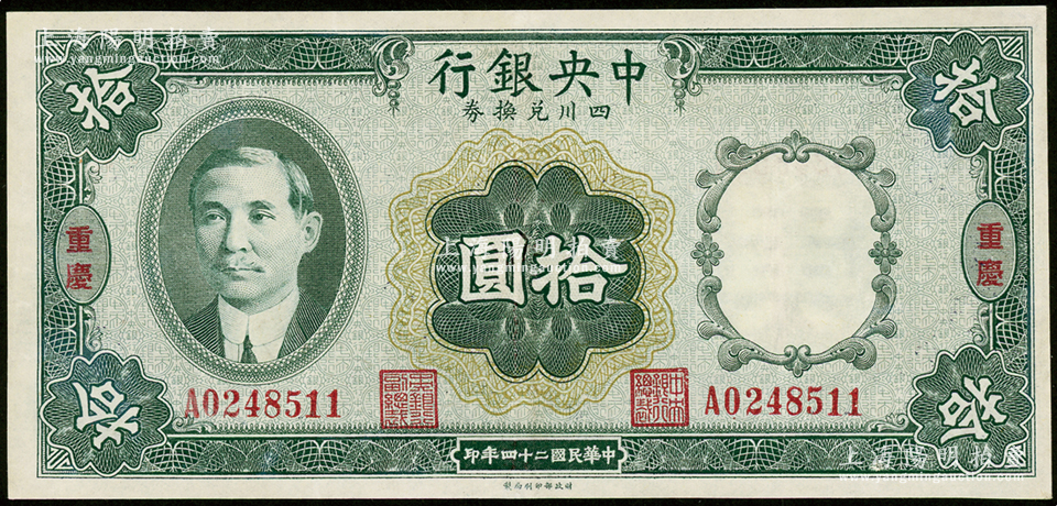 民国二十四年(1935年)中央银行四川兑换券拾圆,重庆地名,资深藏家出品,九成新