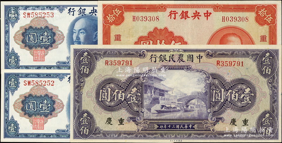 民国纸币4枚,详分:中央银行1940年“重庆”伍拾圆、金圆券1945年壹圆2枚连号;中国农民银行1941年“重庆”壹佰圆;资深藏家出品,九成至全新,敬请预览