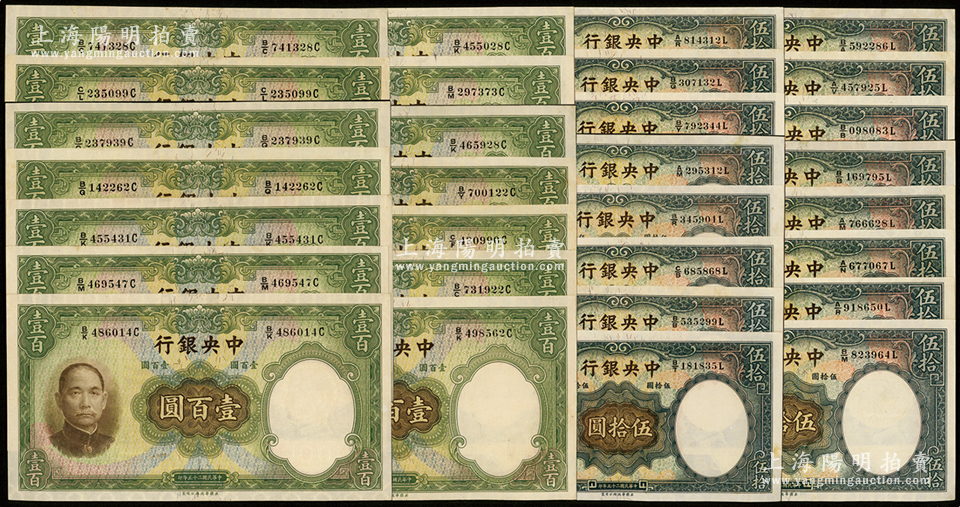 民国二十五年(1936年)中央银行华德路版伍拾圆16枚、壹百圆14枚,合计共有30枚,八至九成新,敬请预览