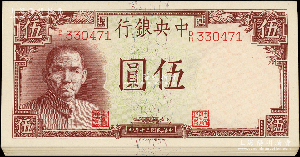 民国三十年(1941年)中央银行德纳罗版“岳阳楼”伍圆共28枚断续连号,上佳品相,原票九八至全新