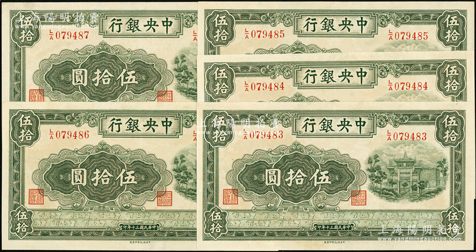 民国三十年(1941年)中央银行信托版伍拾圆共5枚连号,九至九五成新,敬请预览