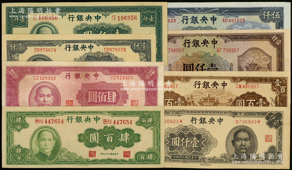 中央银行纸币8种,详分:信托版1944年壹百圆、壹仟圆,大业版1944年肆百圆、1945年壹仟圆,大东版1945年壹仟圆,华南版1945年壹仟圆,中央厂1945年肆佰圆、伍仟圆,九至九五成新,敬请预览