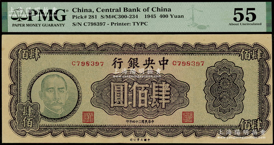 民国三十四年(1945年)中央银行大业版肆佰圆,俗称“木刻版”,PMG 55 AU