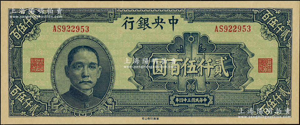民国三十四年(1945年)中央银行华南版贰仟伍百圆,资深藏家出品,上佳品相,九八成新