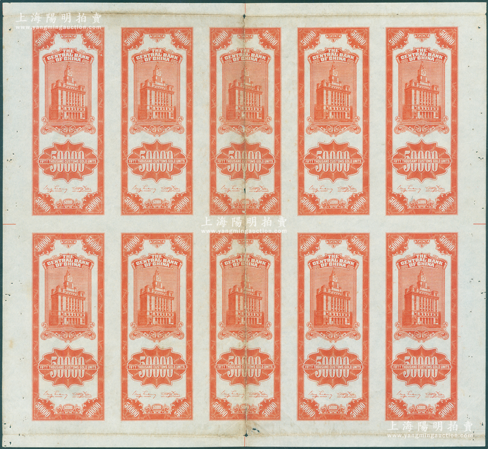 1948年中央银行关金中央厂桔色伍万圆试印票整版共10枚联体,均仅有背面,但其正面均印有底纹,八至八五成新