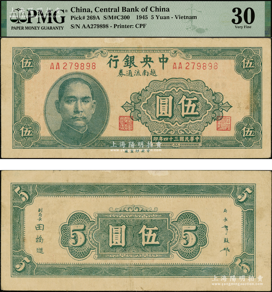 民国三十四年(1945年)中央银行越南流通券绿色伍圆,乃属央行纸币之名誉品,罕见,PMG 30 VF