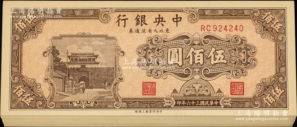 民国三十六年(1947年)中央银行东北九省流通券上海厂棕色伍佰圆共32枚连号,上佳品相,九八至全新