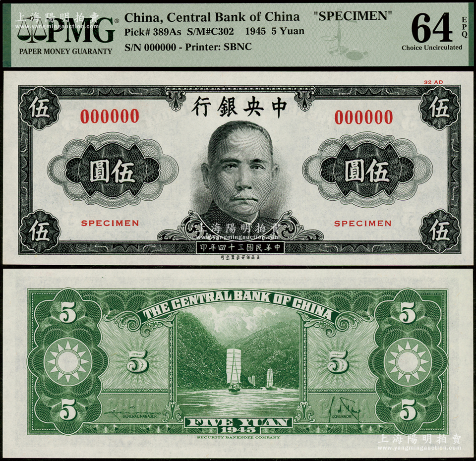 民国三十四年(1945年)中央银行美商保安版伍圆试色样本券,正面黑色/背面绿色印刷(正票为蓝色),少见,全新