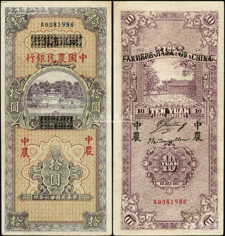 民国廿六年(1937年)四川省银行改中国农民银行拾圆,资深藏家出品,九成新