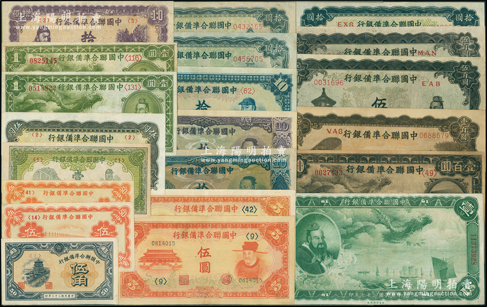 中国联合准备银行纸币共21枚,详分:1938年大龙壹圆、小龙壹圆2枚、壹百圆;1944年伍角、壹圆;无年份版卢沟桥伍角2枚、桔大殿岳飞伍圆2枚、人读书伍圆、大殿关羽拾圆、左关羽右塔拾圆3枚、紫色左关羽右第一泉拾圆、蓝尧帝拾圆、紫尧帝拾圆、左帝右楼阁百圆、双凤伍百圆2枚,八至九五成新,敬请预览