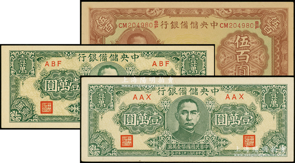 中央储备银行纸币3枚,详分:1942年小广东伍百圆,内有水印;1944年狭长版壹万圆不同冠字2枚;海外藏家出品,其中2枚为九成新、1枚为九八成新