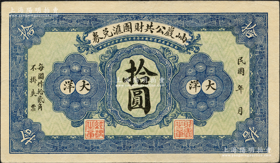 民国年·岫岩公共财团汇兑券大洋拾圆,海外藏家出品,少见,八五成新