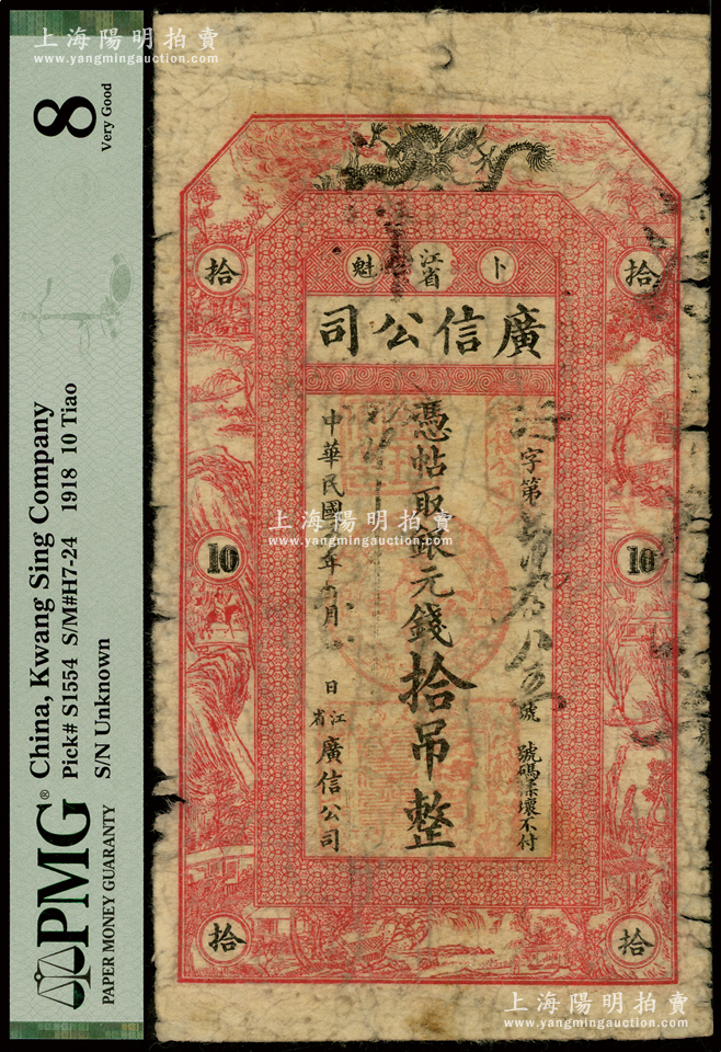 民国五年(1916年)江省·广信公司银元钱拾吊,上印飞龙图及古人物风景,乃属清代沿用版,与光绪或宣统版图文完全相同,罕见,六成新
