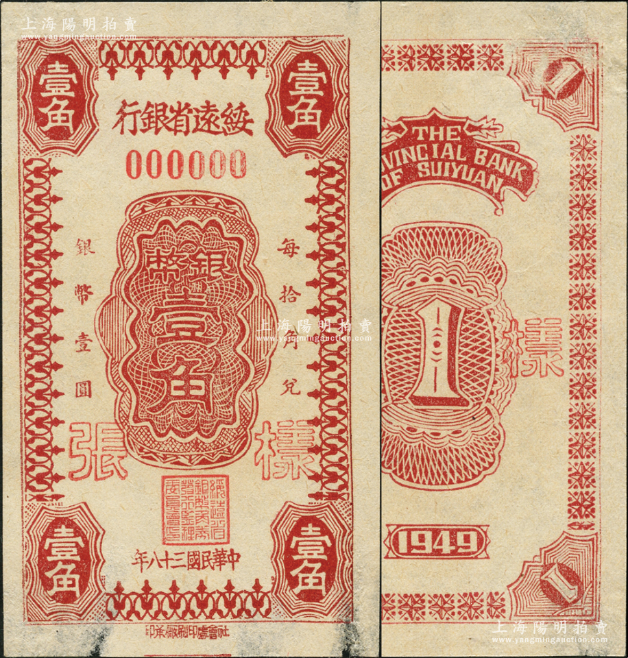 民国三十八年(1949年)绥远省银行银币壹角样张,正背共2枚,社会处印刷厂承印,罕见,八五成新
