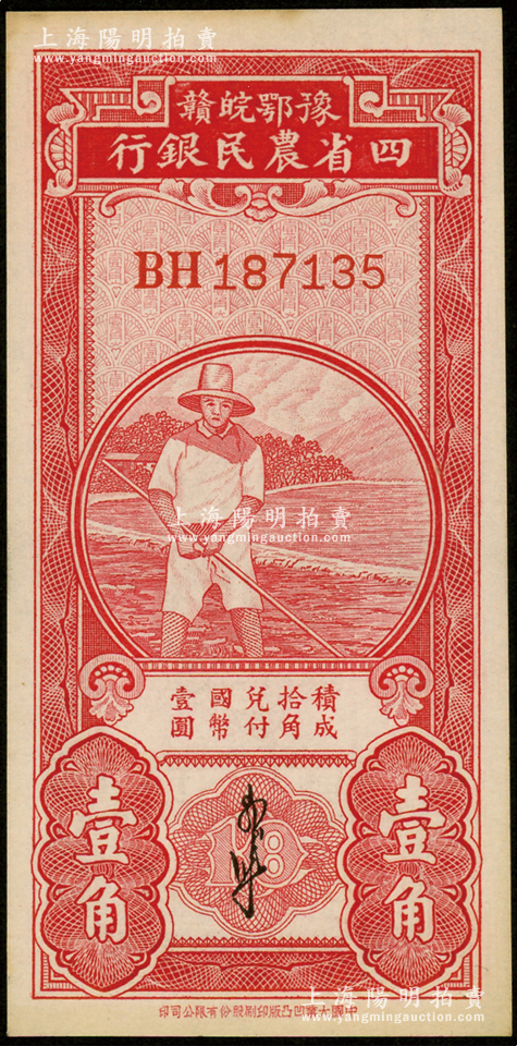 民国无年份版·豫鄂皖赣四省农民银行红色农夫图壹角,双字轨,郭外峰签名;源于前辈名家之遗藏,九五成新