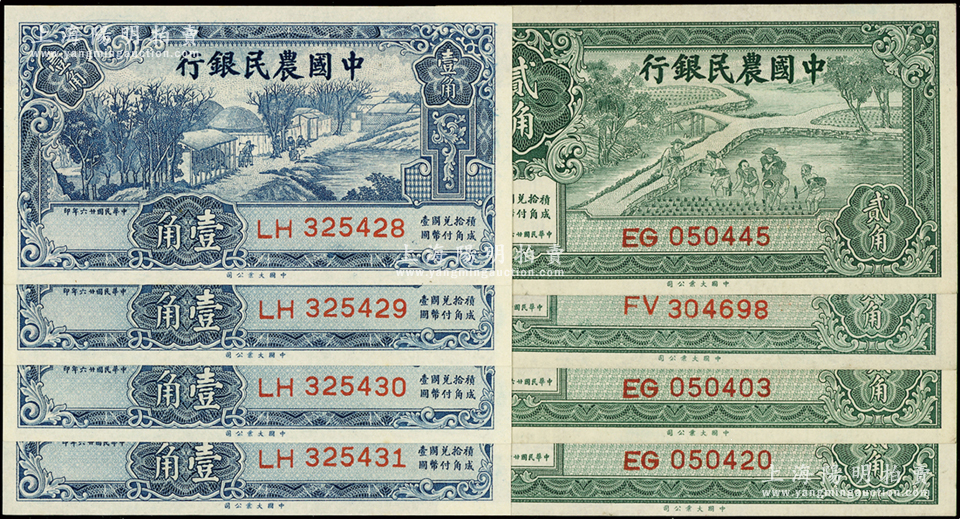 民国廿六年(1937年)中国农民银行大业版壹角、贰角各4枚,合计共有8枚,其中壹角券连号;源于前辈名家之遗藏,除1枚九成新外,其余约九八至全新