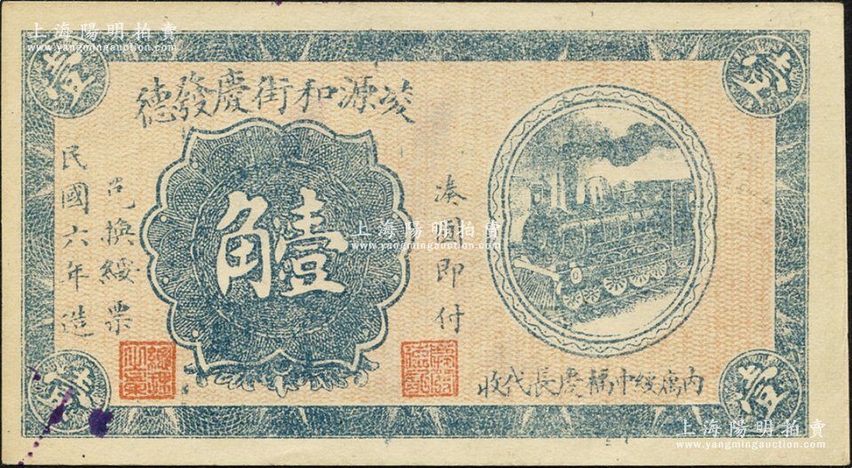 民国六年(1917年)凌源和街庆发德壹角,热河钱庄钞票,亦可在绥中县兑换,上印火车图,背印日本天守阁图;源于日本名家森本勇先生之旧藏,罕见,九五成新