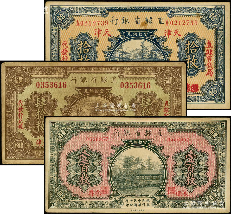 直隶省银行纸币3种,详分:1924年保定改天津拾枚、天津肆拾枚,1925年永遵地名壹百枚,七至八成新