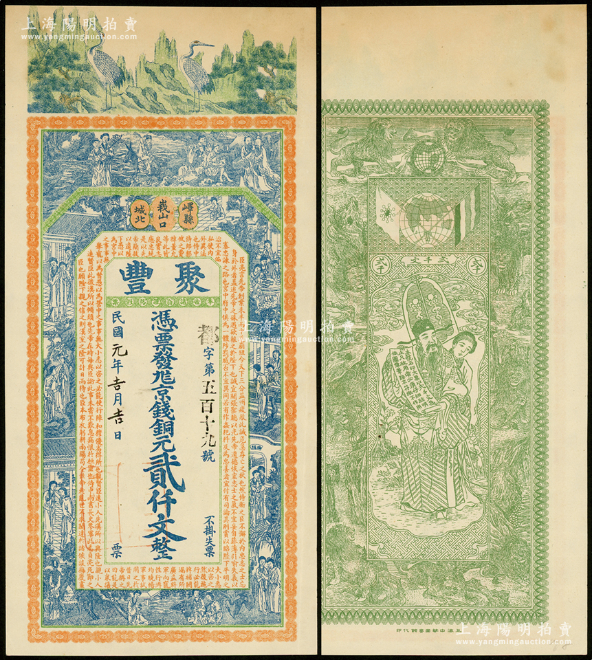 民国元年(1912年)聚丰京钱铜元贰仟文,山东峄县钱庄钞票,上印松鹤、和合二仙、十八罗汉图及三国蜀汉诸葛亮《前出师表》古文,背印天官赐福与九狮图,由谈梅庆绘稿,上海中华图书馆代印,形制极为美观,罕见,九成新